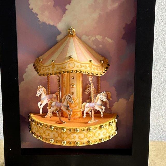 Step into a magical moment with the PickScene Golden Fantasy Carousel — a beautifully crafted miniature scene featuring an elegant gold-trimmed carousel set against a soft pink and purple sky backdrop. Perfect for collectors, dreamers, and display lovers, this fantasy-themed diorama blends whimsy and charm with detailed textures, pastel tones, and a warm glow. Ideal for photo styling, storytelling setups, or simply adding enchantment to your shelf. Idea inspired by one of our wonderful customers - Carole